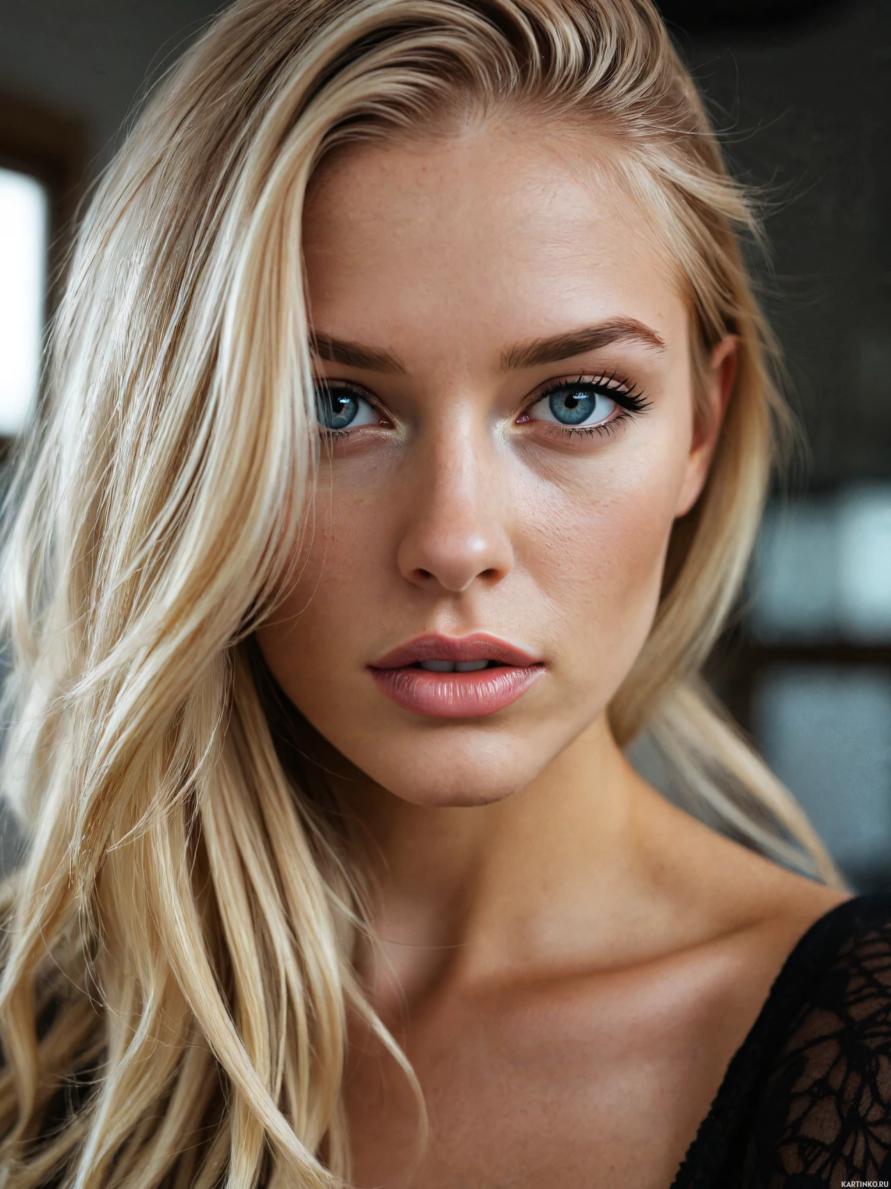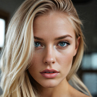 blonde hair. Her eyes are a striking blue, and she has