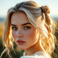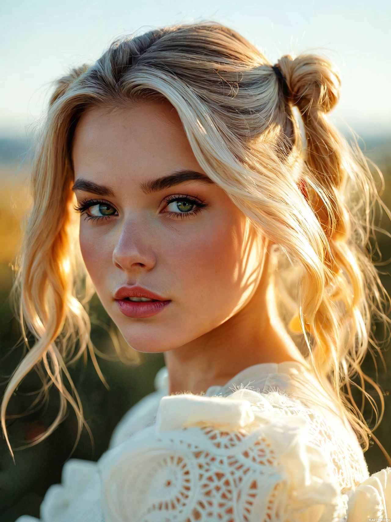 a young woman with fair skin and blonde hair styled in loose waves. She has striking