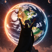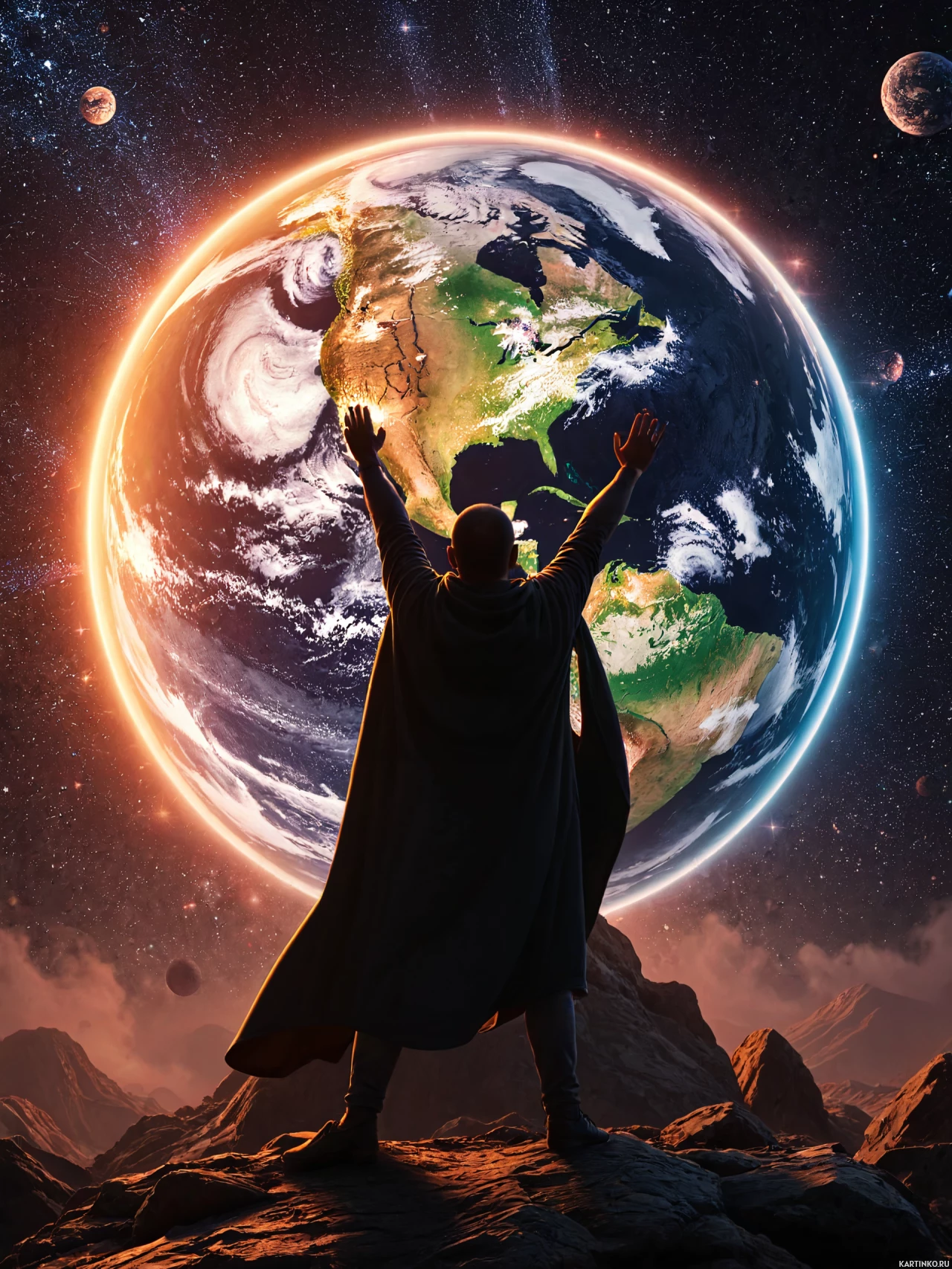 multiple planets visible in the sky, suggesting a scene from space or near an astronomical event. The overall tone of the image is one of optimism and wonder, possibly conveying a message about humanity's relationship with our planet and the universe beyond it.