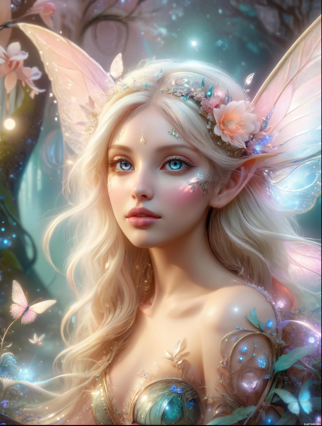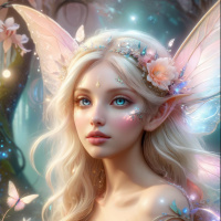 an ethereal setting that includes sparkling lights, butterflies, and a whimsical forest backdrop, which further supports the fairy theme. The character's attire consists of