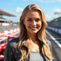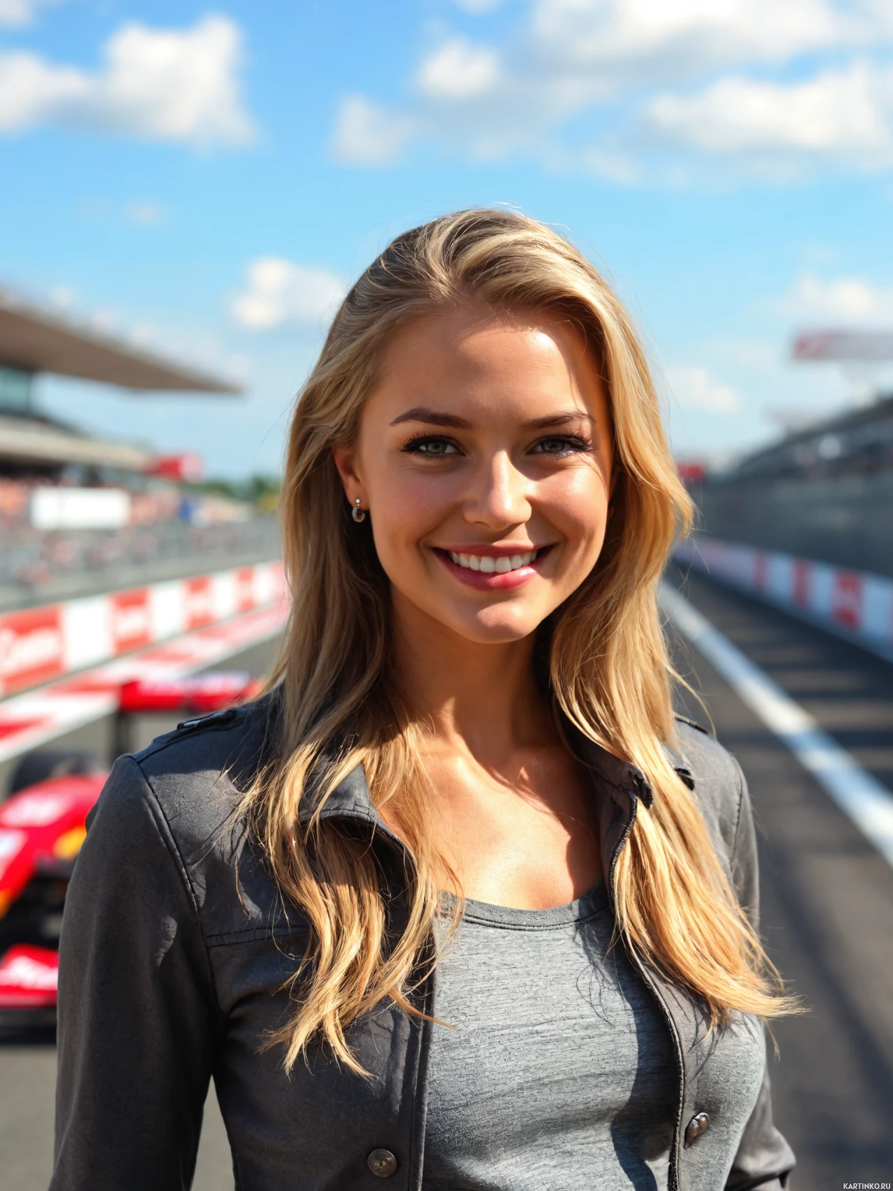 blonde hair and is smiling at the camera, looking directly towards it with her head turned slightly to the side for a flattering portrait. Behind her is a Formula 1 car, identifiable by its