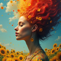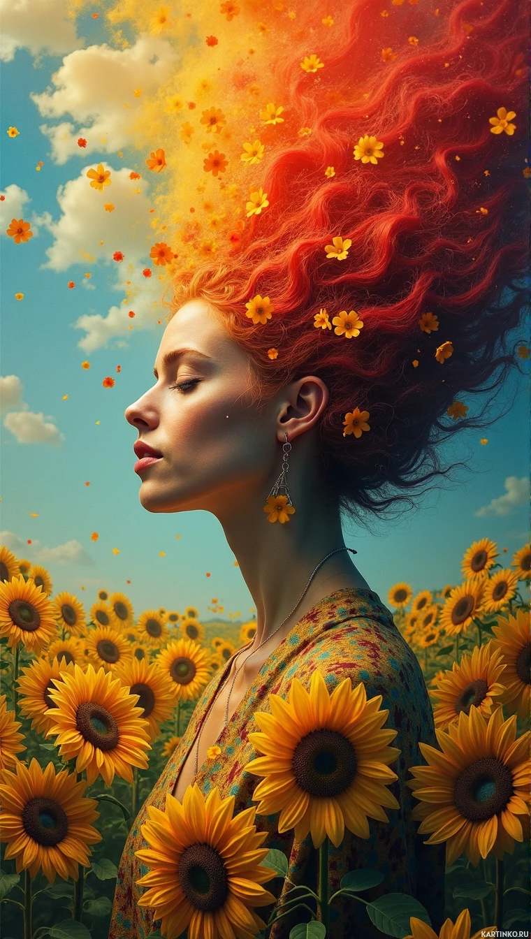 red hair, set against the backdrop of a bright sky filled with fluffy white clouds and scattered sunflowers. She appears to be in a tranquil