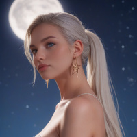 pink flowers at her feet, which might suggest a garden or park environment. The moon is visible in the background,