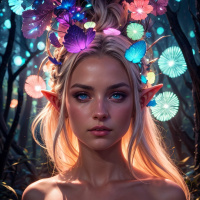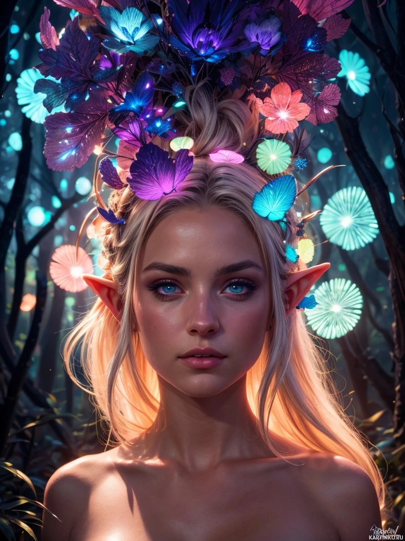 white hair and pointed ears, which are typical characteristics associated with elves in fantasy lore. The elf has a large, ornate headpiece made up of various gems that emit a soft light, adding to