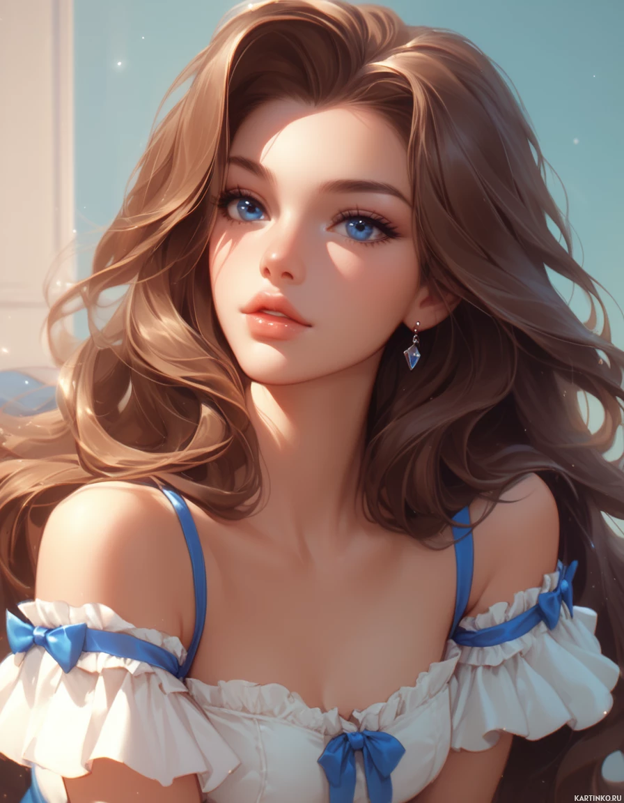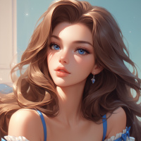 fair skin and is wearing what appears to be a white blouse adorned with blue bows. The style of the image suggests it could be from a game or