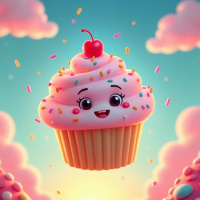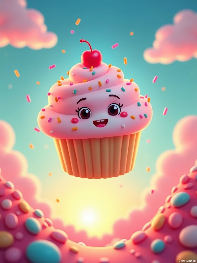 a cheerful expression and is adorned with pink frosting, sprinkles, and cherry on top. Surrounding the cupcake are fluffy clouds in