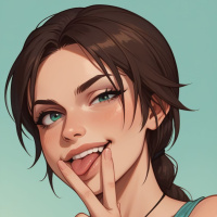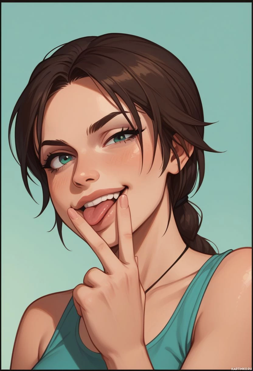 a female character who appears to be Lara Croft. She is smiling and sticking out her tongue playfully. Her eyes are closed, giving