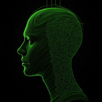 The image features a three-dimensional representation of a person's profile, with a focus on the head. The head is drawn in a stylized manner, showing facial features such as an eye, nose, and mouth, along with hair that appears to be flowing or falling from the top. There are no