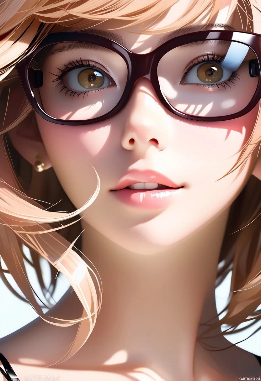a fair complexion and is wearing glasses. The artwork showcases her in