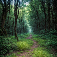 forest scene. The path through the middle of the image leads towards a clearing or opening at the end, where sunlight filters through