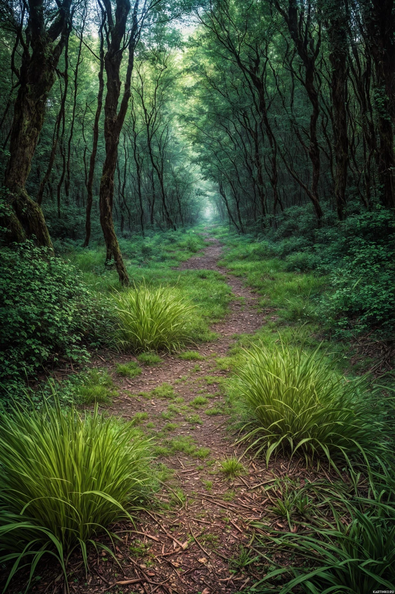 green leaves and have thick trunks that curve and twist around each other, creating a sense of depth and organic complexity. The forest floor is covered in moss and small plants, and the overall atmosphere is one of tranquility and
