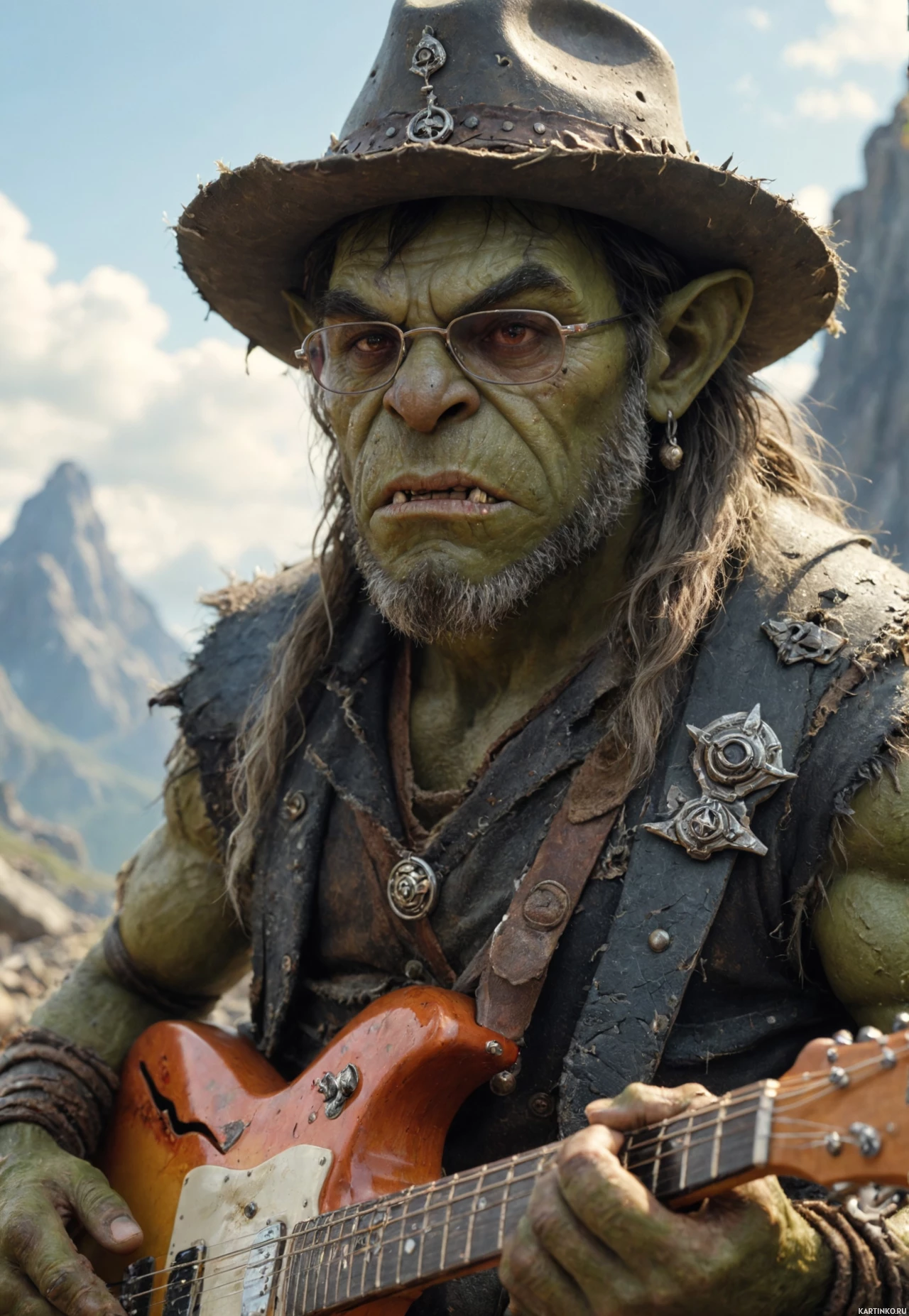 an electric guitar, suggesting he might be involved in music or some form of performance. The background suggests an outdoor, possibly mountainous environment, indicating that the scene could take place in a wilderness or at
