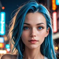 a young woman with striking blue hair. Her makeup is accentuated, giving her an intense and expressive look. She appears to be wearing some tattoos on visible skin areas. The background suggests she might be in