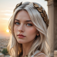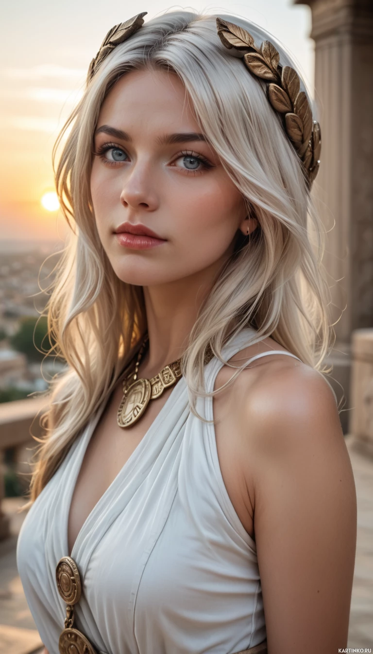 Roman attire, including a toga-style dress that drapes over her shoulders, revealing a portion of her skin. Around her neck, there appears to be a chain or necklace that adds to the classical theme of her outfit. The setting suggests a historical or mythological context, possibly near structures resembling Roman architecture during sunset or sunrise, given