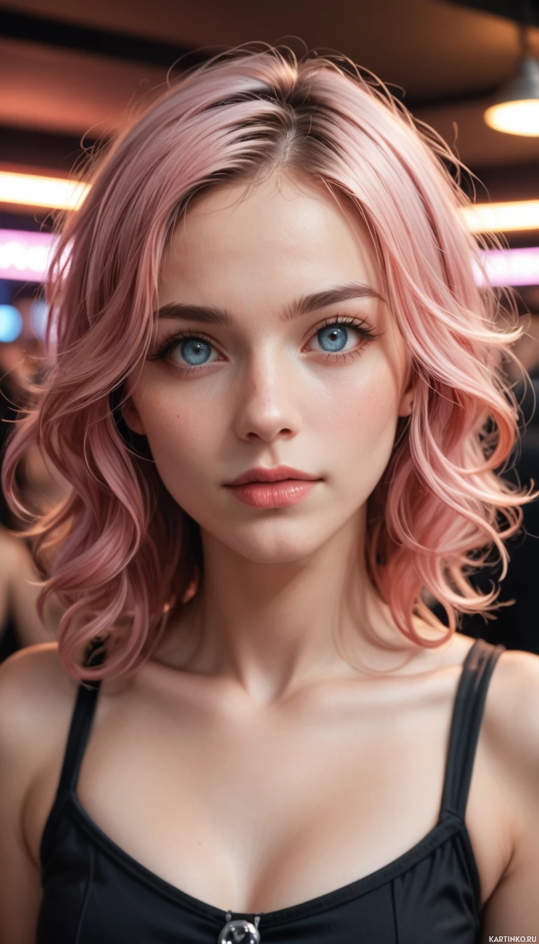 subtle eyeliner and lipstick that match the pink undertone of her hair. The woman's expression is neutral with