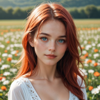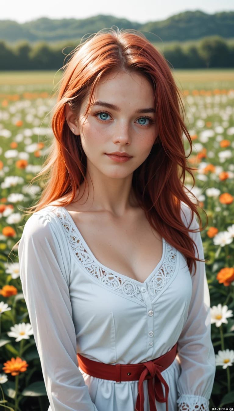 red hair standing in a field of flowers. She appears to be looking directly at the camera with