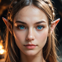 blonde hair and is wearing what appears to be an elf costume, consisting of pointed ears and a light-colored tunic. Her expression is serious and contemplative, as she gazes directly at the camera. The background suggests a fantasy or forest setting with muted colors that contrast with her