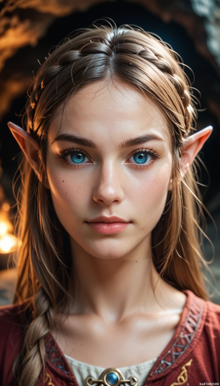 fair skin and vibrant eyes. The image is likely related to a fantasy theme given the elements of her costume and the atmosphere of the backdrop.