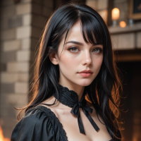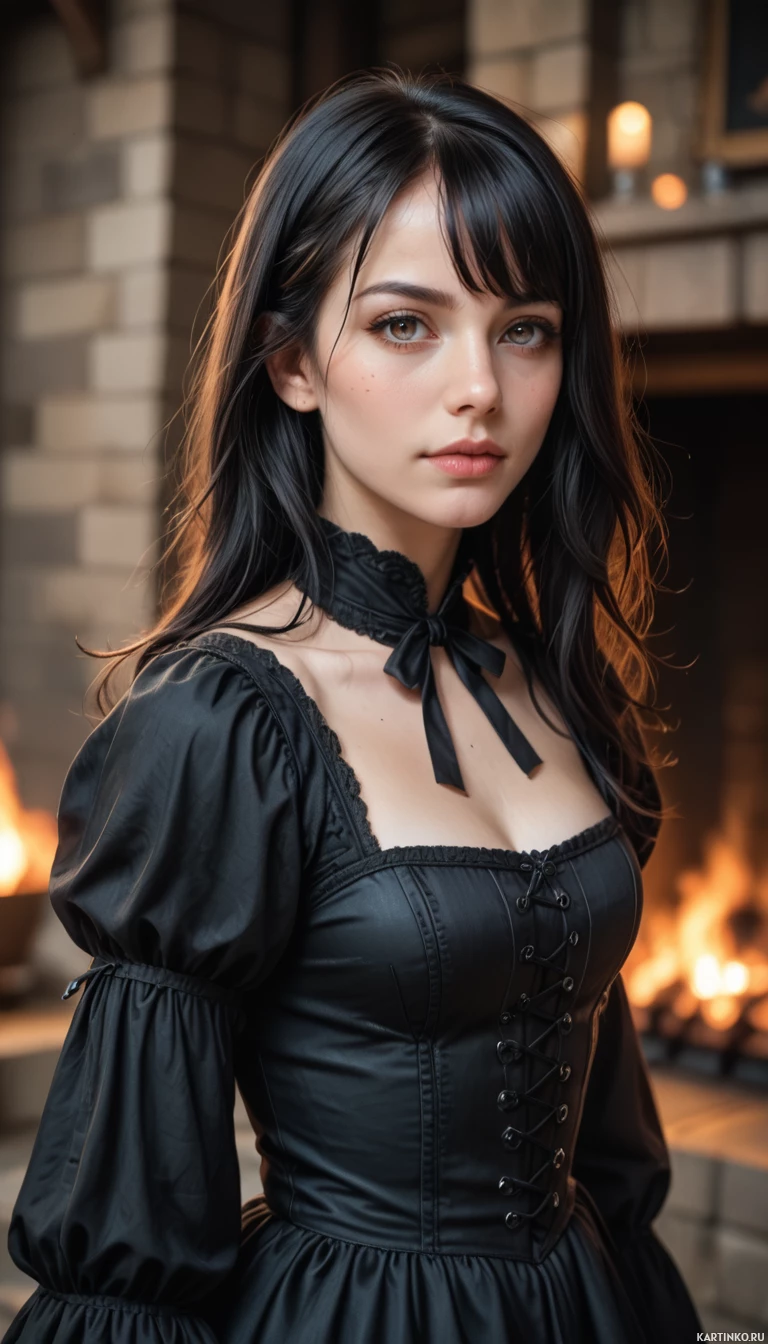 a slight tilt to her head. The background includes what appears to be an old fireplace with glowing logs, contributing to