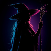silhouette of a person standing in front of a vibrant background with purple and pink hues. This silhouette is commonly associated with the witch or wizard archetype, as indicated by