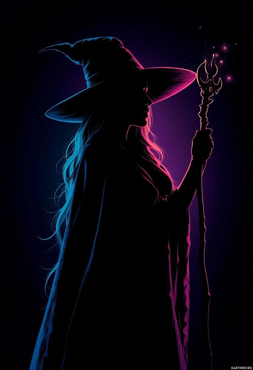 the pointed hat typically worn for such characters. In this particular depiction, the figure has long flowing hair and is draped in what appears to be a cloak or robe, contributing to the mystical witch theme. The figure is holding what looks like a wand or staff, which further enhances