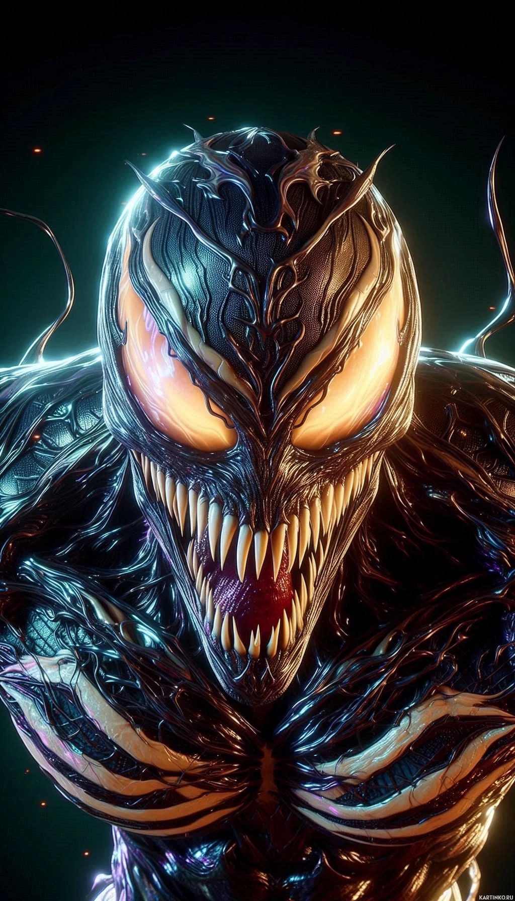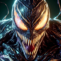 The image features a character known as Venom. This character is typically portrayed as an alien symbiote with an appearance that includes a black suit, white spikes, and large
