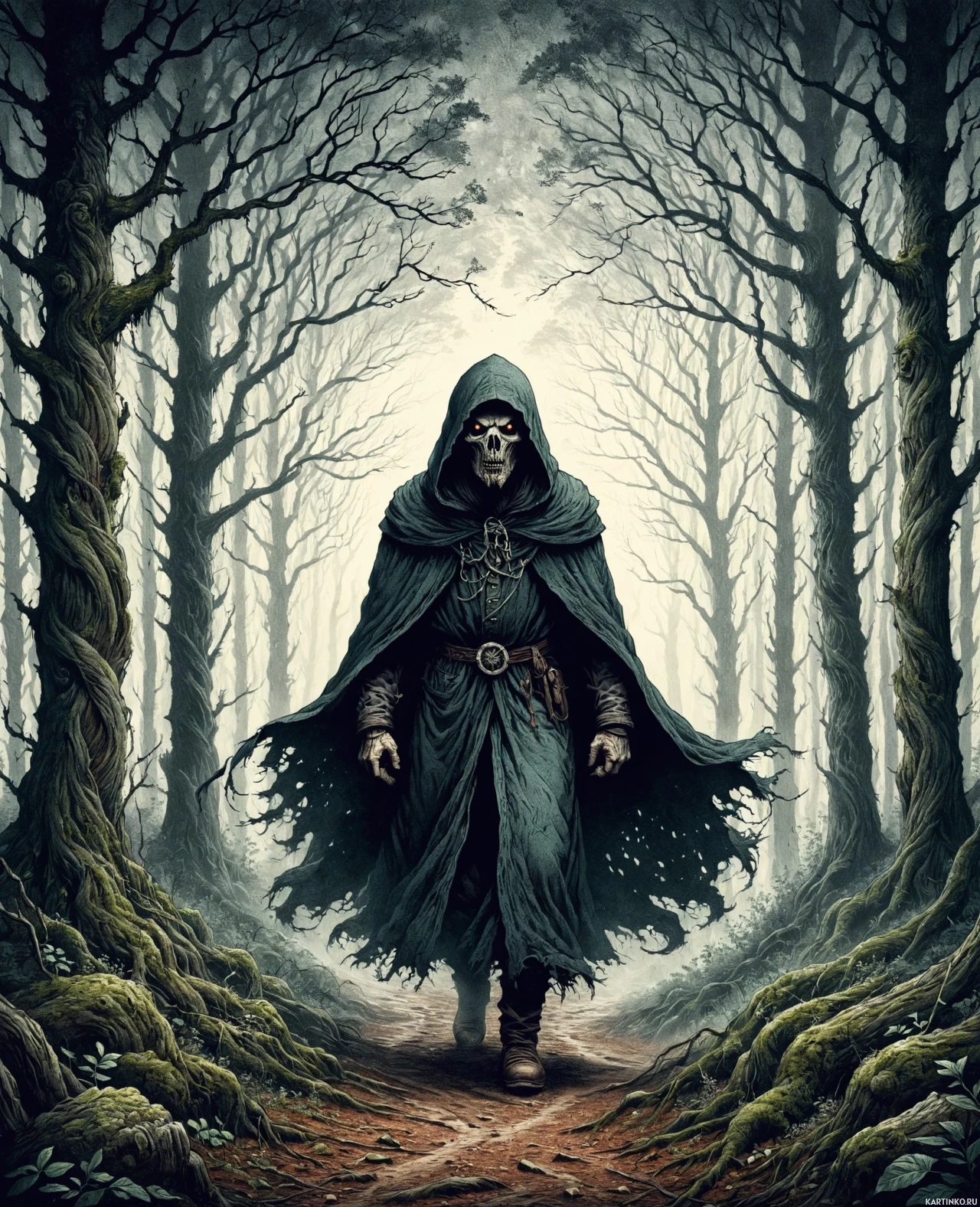 a fantasy scene set in a dense, eerie forest. At the center stands a figure dressed in robes that resemble medieval or