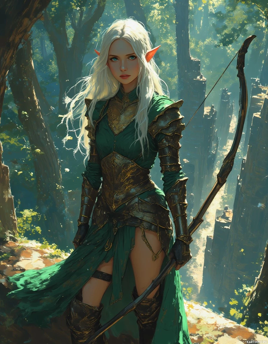 white hair and her attire consists of armor with green elements, possibly resembling chainmail or plate armor, which suggests she might be prepared for combat. She holds a bow in one hand, indicating she might be