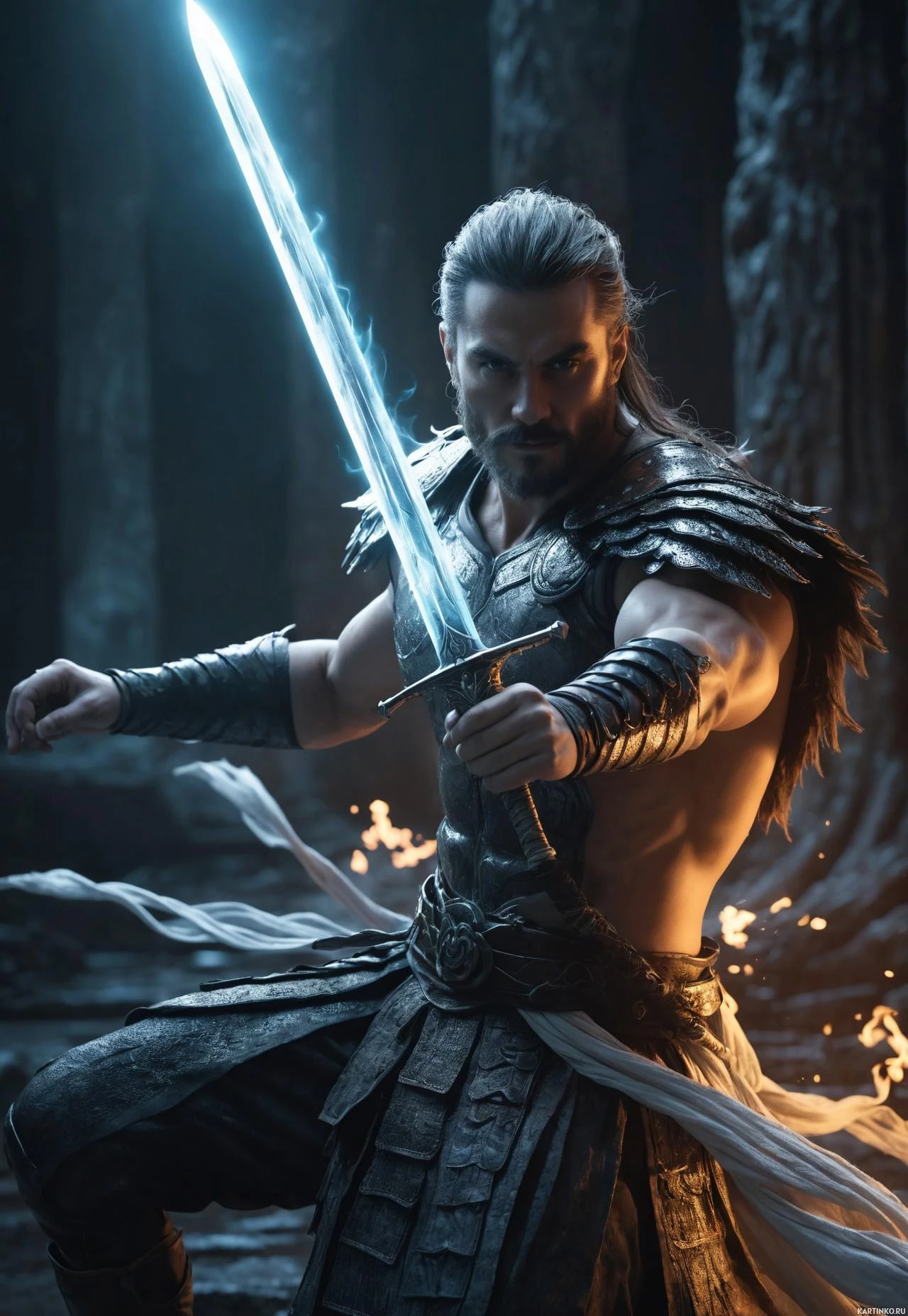 muscular build and beard. He is wearing a helmet that has animal horns protruding from the sides, suggesting a fantasy or mythical theme to his attire. In one hand, he holds a sword with a blade that appears to be glowing blue. His stance and expression convey determination and readiness for battle. The background is dark and mysterious, hinting at an ancient or mystical setting. There are what appear to be flames or