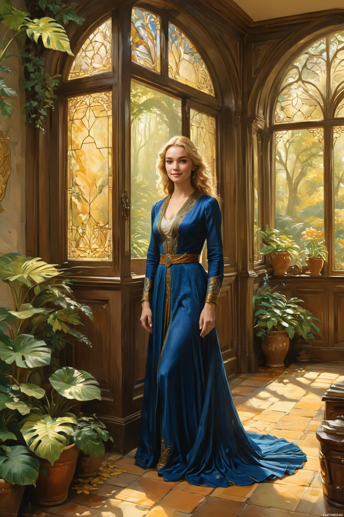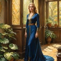 blonde hair and is wearing a long blue dress that appears to be designed for a historical or fantasy setting. The dress features elaborate detailing at the waist, suggesting a costume from a specific time period or a fictional context. Behind her, there are
