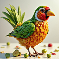 a spectrum of colors including yellow, green, and blue. The bird is perched on one leg with the other tucked under its wing. The parrot is standing amidst a scattering of brightly colored fruits. There are red berries, lime halves, and