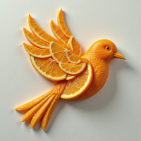orange slices to create realistic details such as feathers, eyes, beak, and feet, resulting in an almost lifelike depiction of a bird made entirely from fruit.