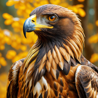 fall season. The lighting in the photograph highlights the textures and colors of the eagle's feathers, creating