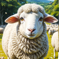 The image features a stylized, animated sheep. It is characterized by woolly fur and prominent facial features such as