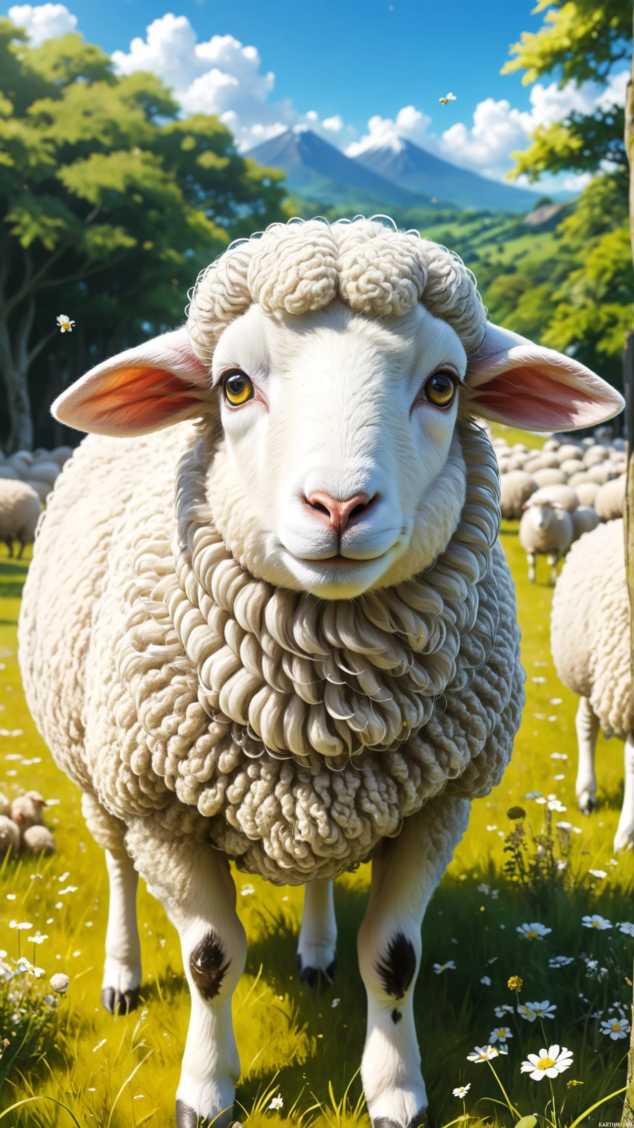 large eyes and a distinct nose. The sheep appears to be standing in a serene, grassy field with trees and a mountain in the background under