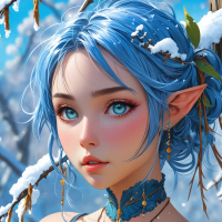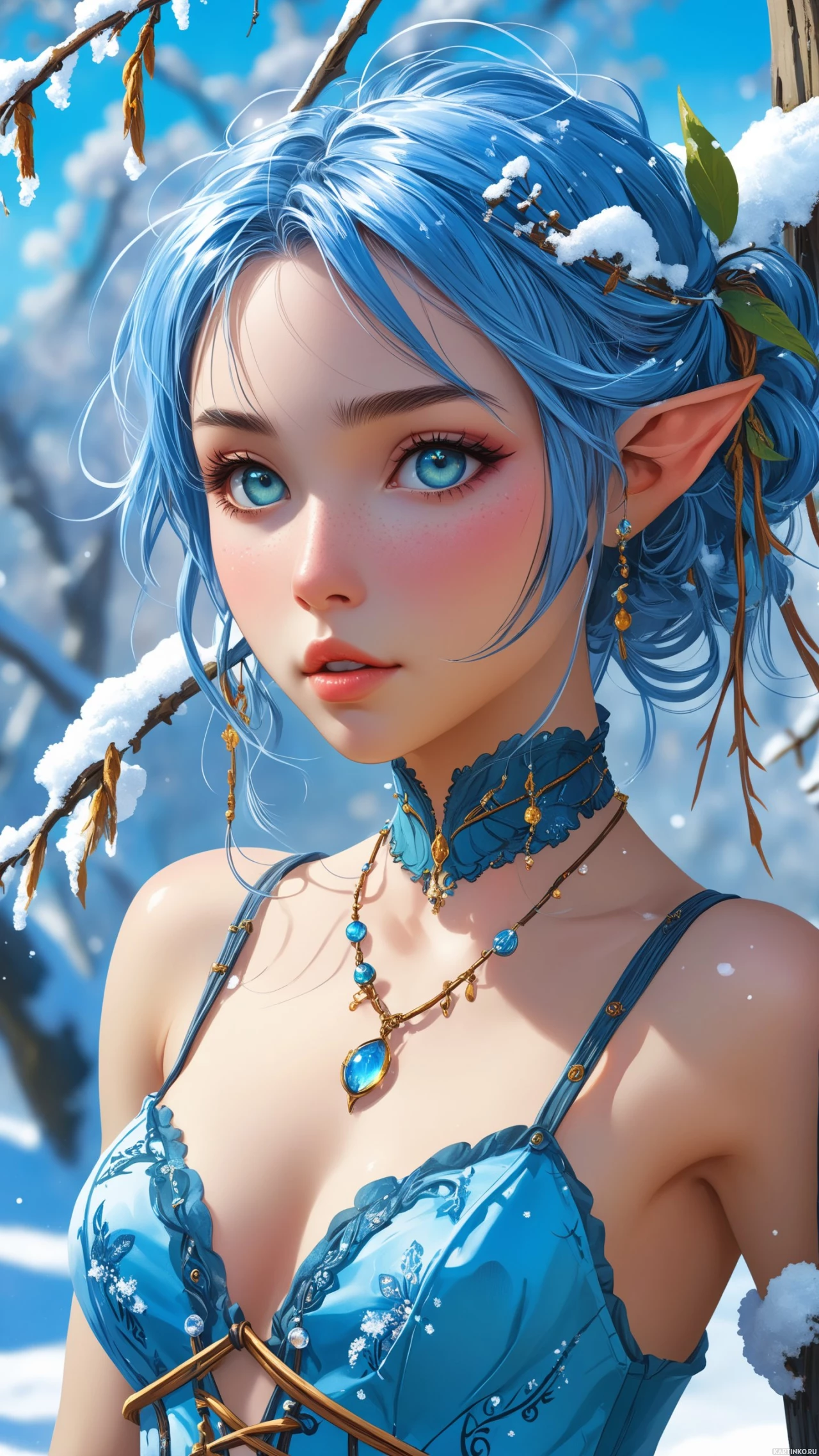 a blue dress or shawl with intricate details and adornments, such as lace and jewels, that suggest she might be dressed for a special occasion. The background is winter-themed, with snow falling gently around her, giving the scene a dreamlike or fantastical quality.