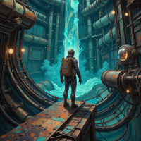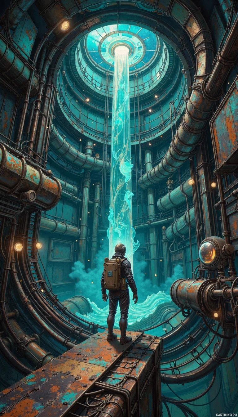 a complex machine or spacecraft that has some sort of portal or opening at the center. The environment is industrial in style with pipes and wiring filling the background. The overall atmosphere suggests a scene from