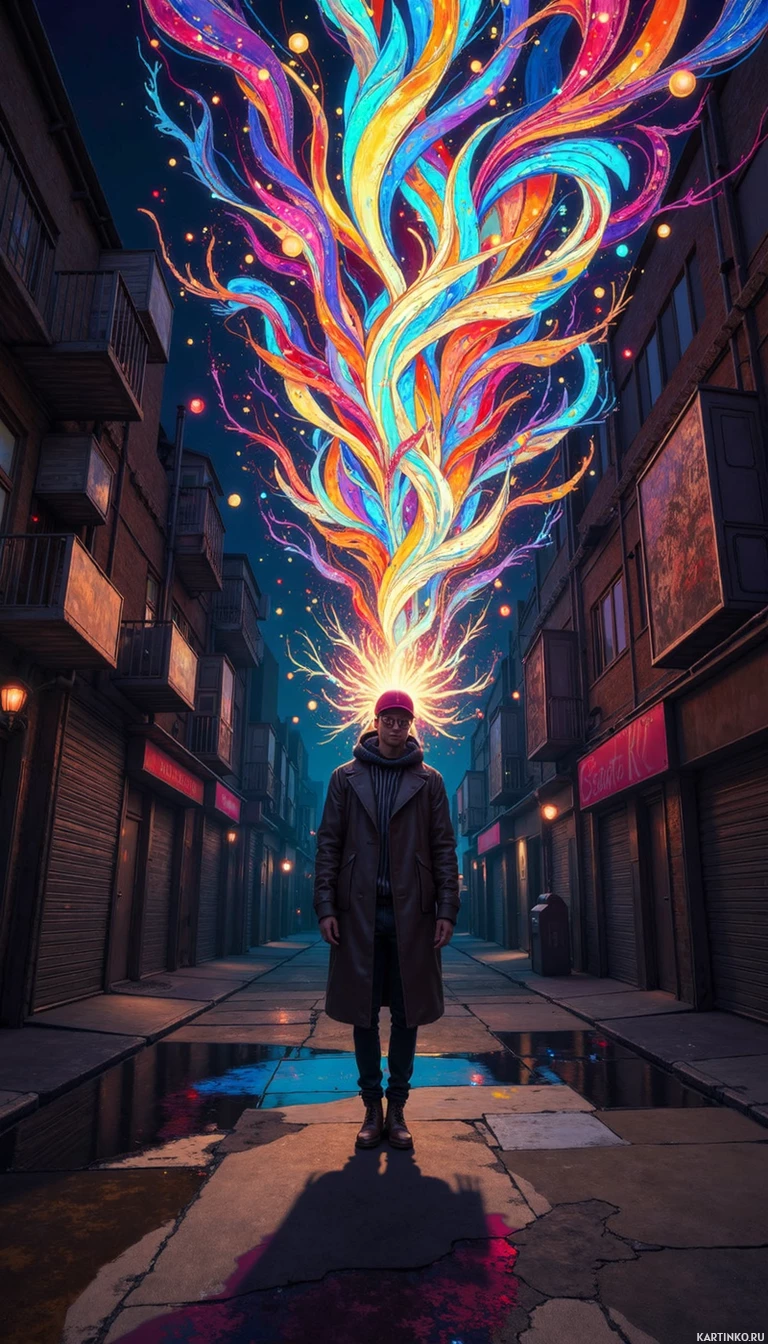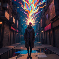 muted colors in the rest of the image. This could be a digital manipulation or an artistic representation rather than a real scene. No men are depicted; there's only one figure present, which is described as 'a person' rather than a man. There is no indication of light in the image apart from the energy or fireworks.