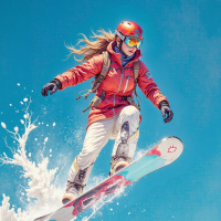 a red jacket with white and black accents, white pants, and a helmet with goggles. Her