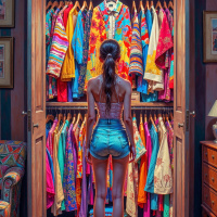 a sleeveless top and shorts, and she appears to be looking at the assortment of clothing items available for selection. The clothes range in colors and styles, suggesting that this may be a walk-in closet or a personal