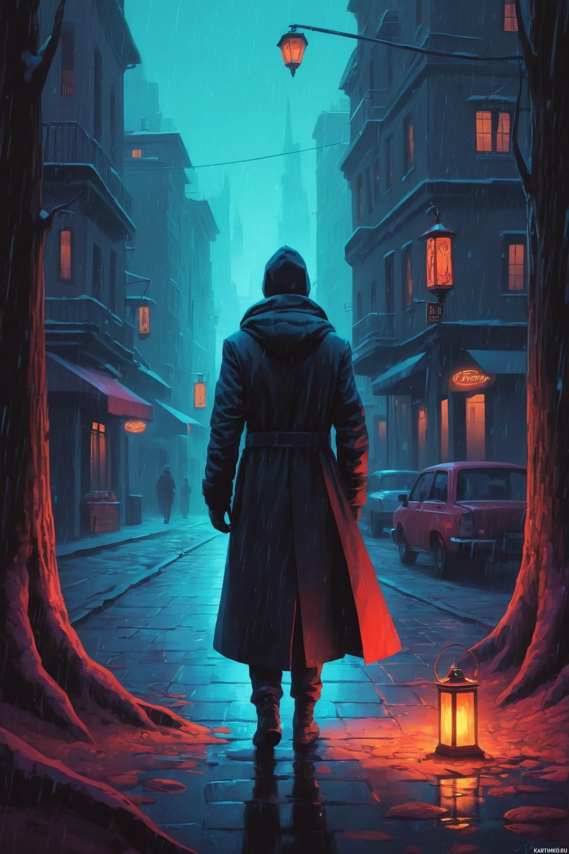 street at night during rain. The individual is facing away from the viewer, looking out onto the wet streets, which are illuminated by lanterns and the distant glow of