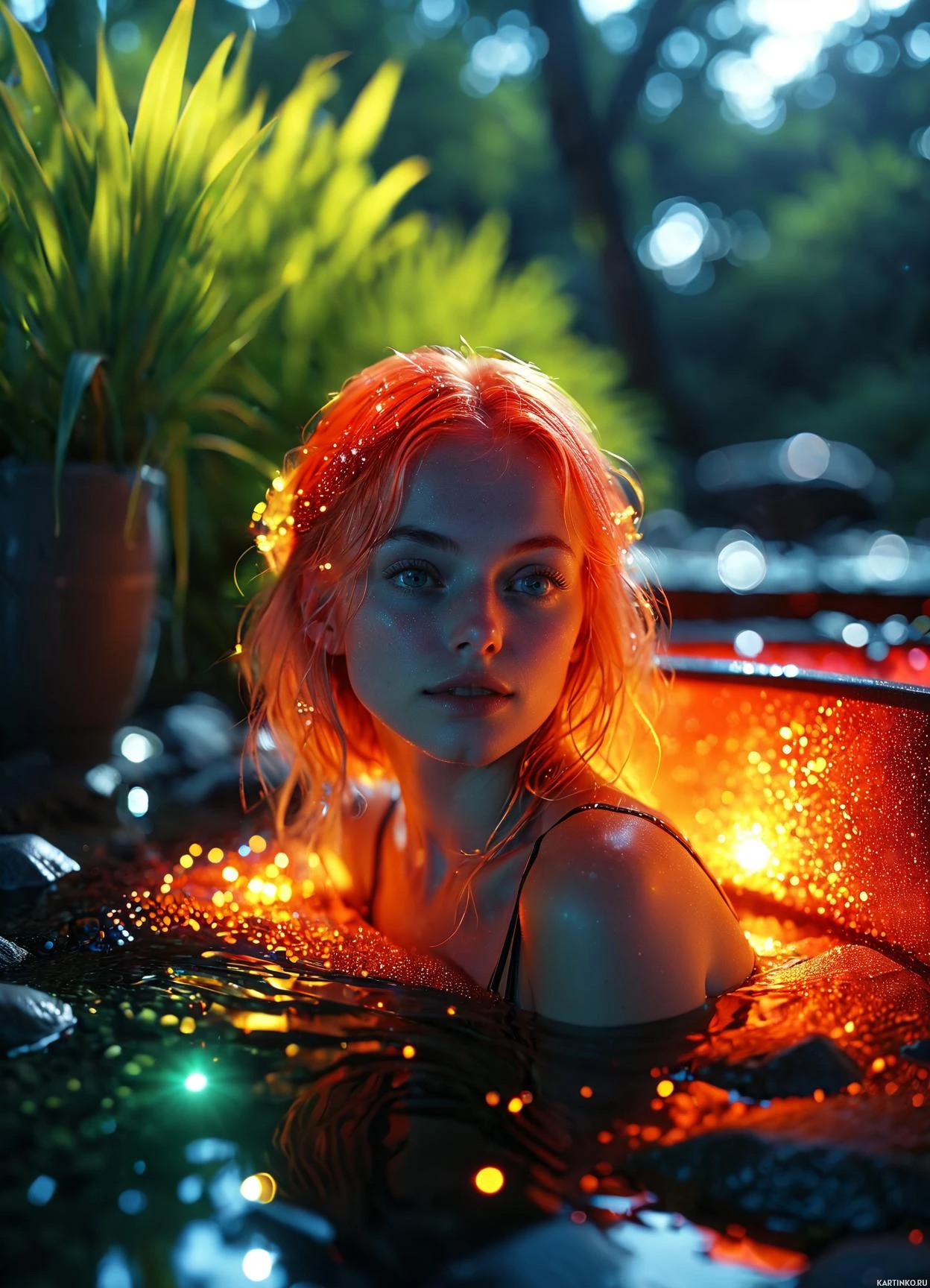 a young woman with red hair who appears to be sitting in a shallow body of water. The water has