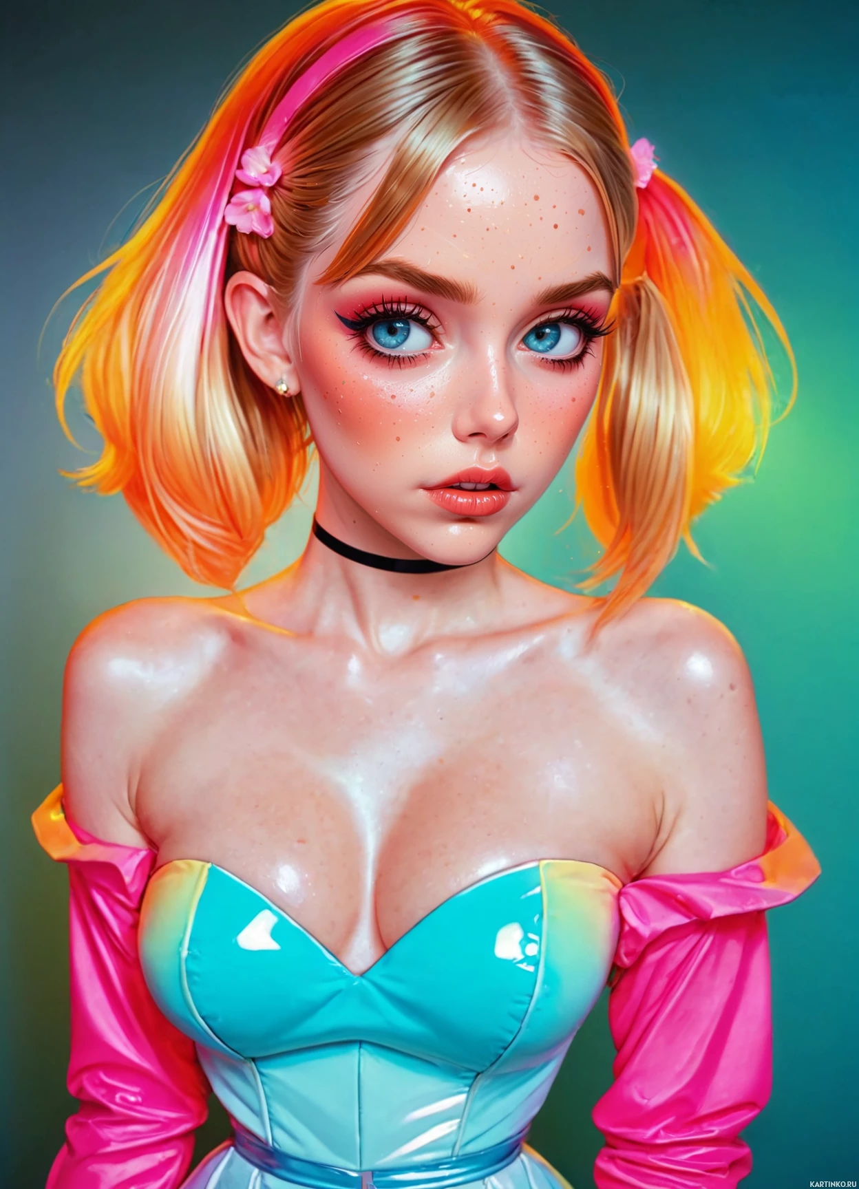 blonde hair with colorful highlights and is adorned with pink bobby pins in her hair. Her eyes are blue, with what appears to be cosmetic wing liner or similar eye accentuation on each side. The character has