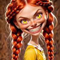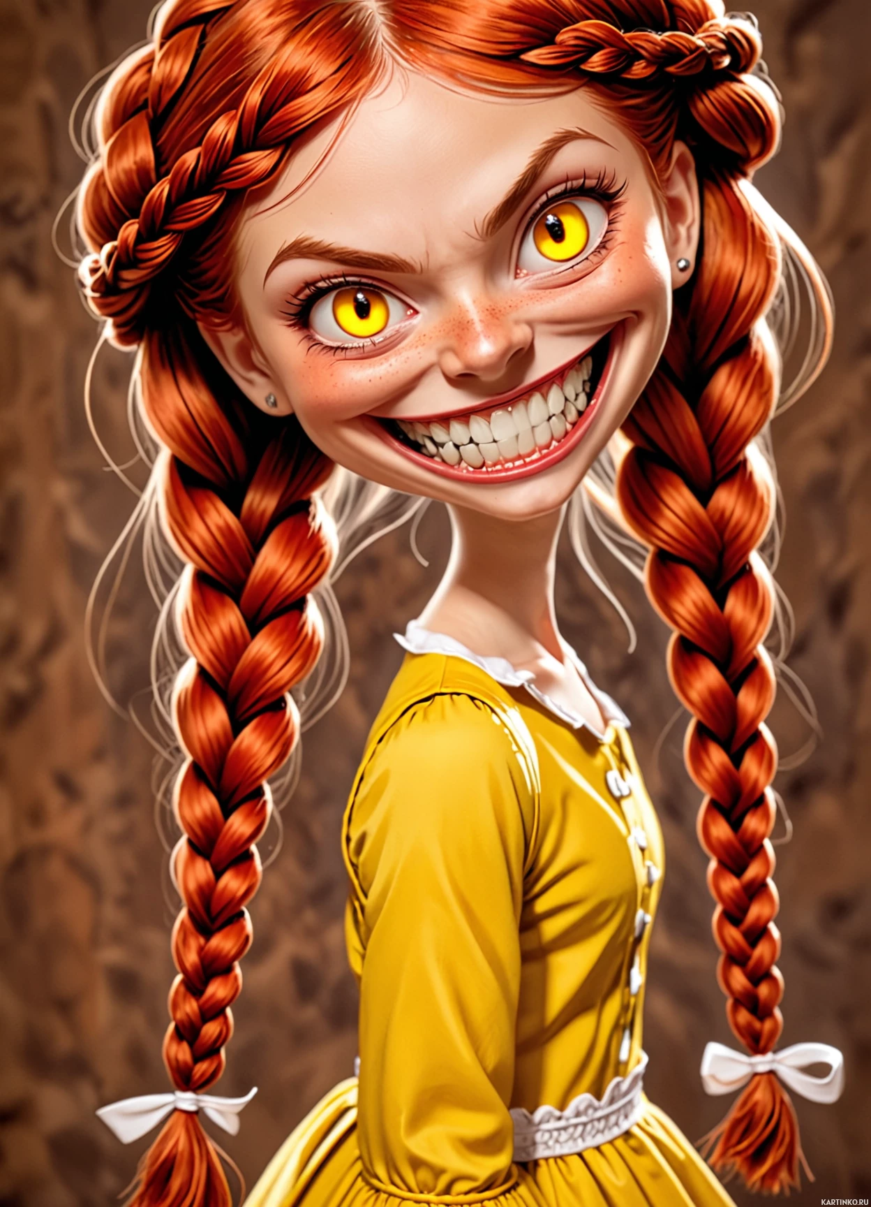 red hair. She is smiling broadly and has an exaggerated expression on her face, with