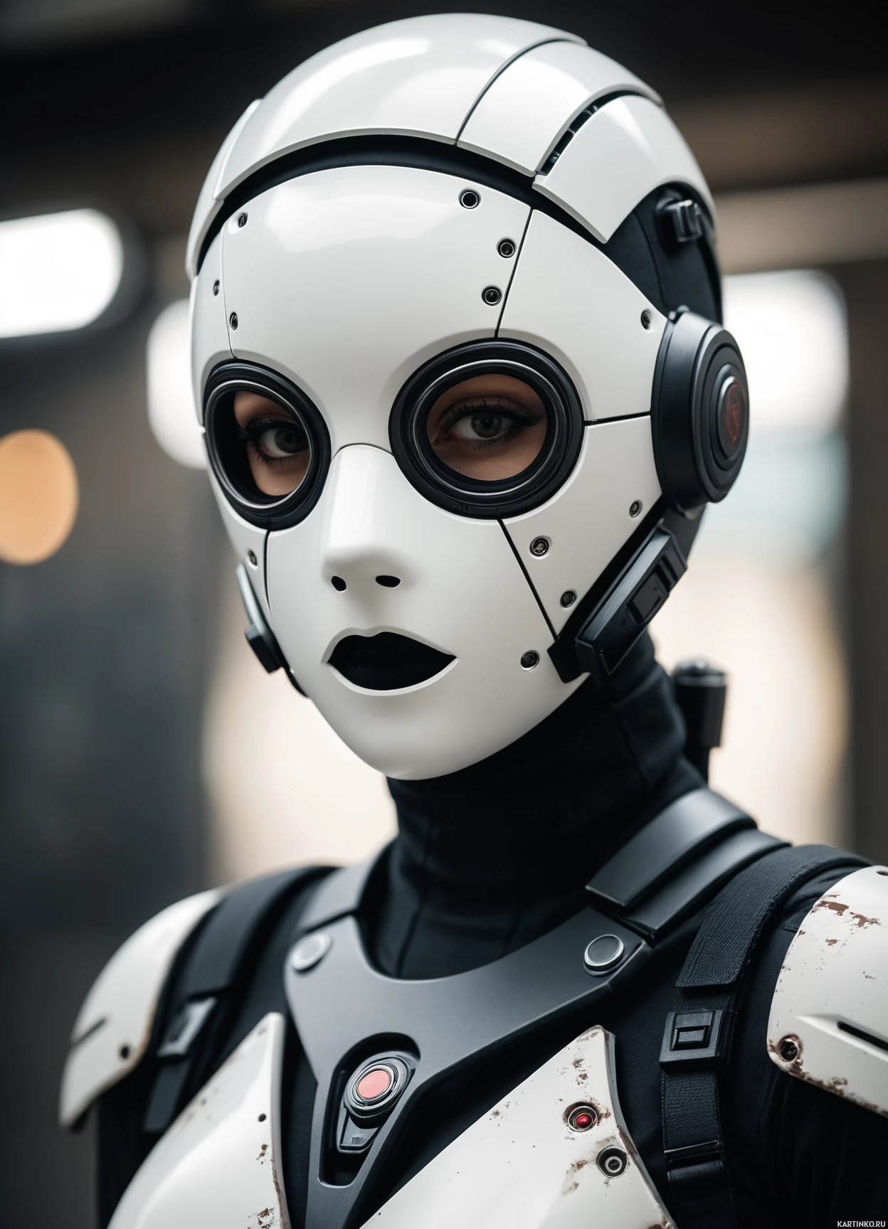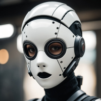 science fiction-inspired attire. The individual appears to be wearing a highly detailed and realistic helmet with a white, robotic-looking visor that completely covers the eyes and nose area, giving
