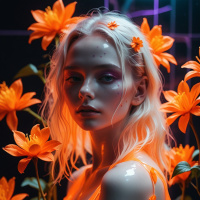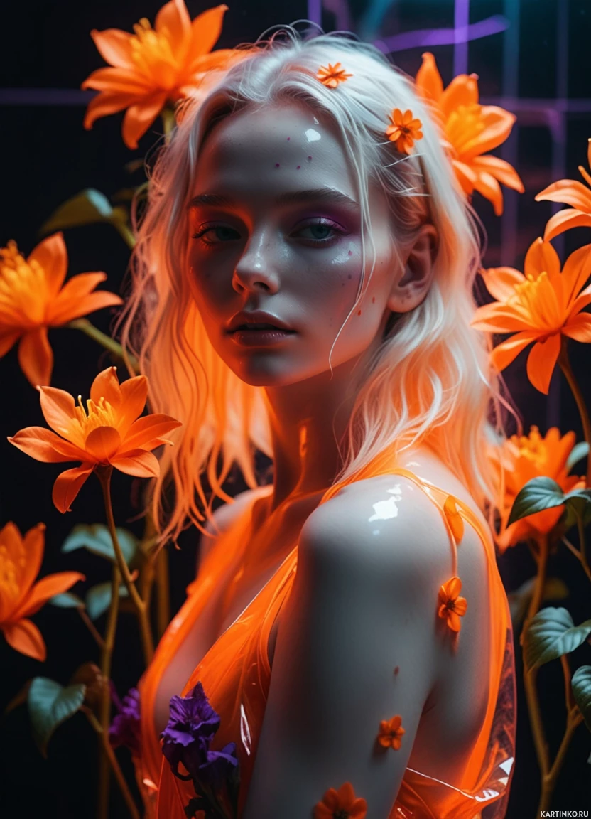 white hair, looking down at the flowers she is holding. She has an ethereal appearance and is wearing a vibrant orange top with