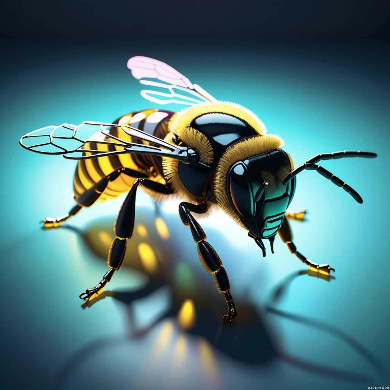 body structure and wings with delicate veins. The bee appears to have a pair of antennae and six legs, which are