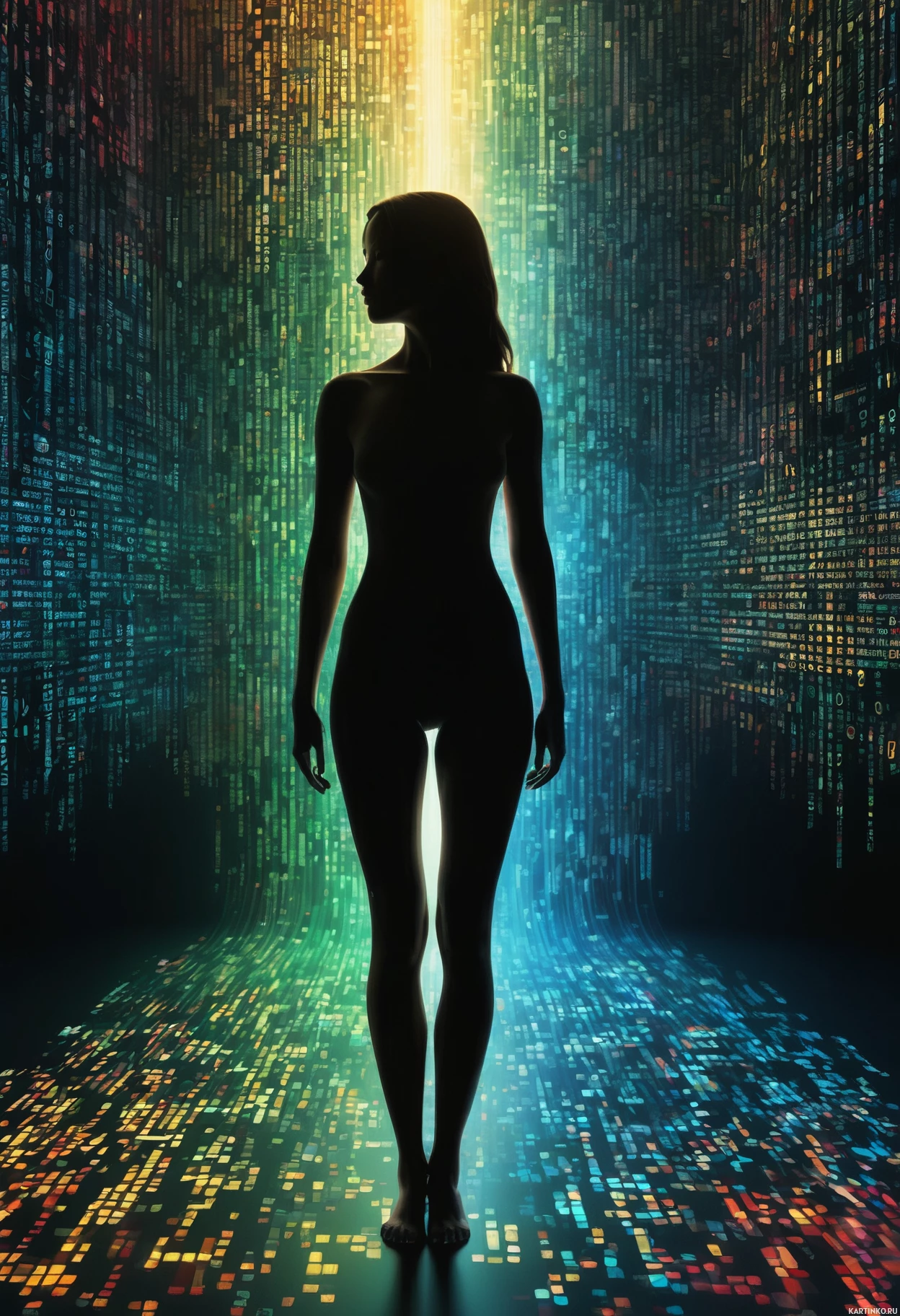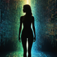 На картинке изображена женщина, стоящая в центре. Её силуэт выделяется на фоне, заполненном, кажется, цифровыми интерфейсами или дисплеями, что указывает на тему, связанную с технологиями или кибернетикой. Освещение отбрасывает её тень на пол позади неё, добавляя глубину композиции. Цветовая гамма холодная, преобладают синие и зелёные оттенки, что создаёт футуристическую атмосферу.