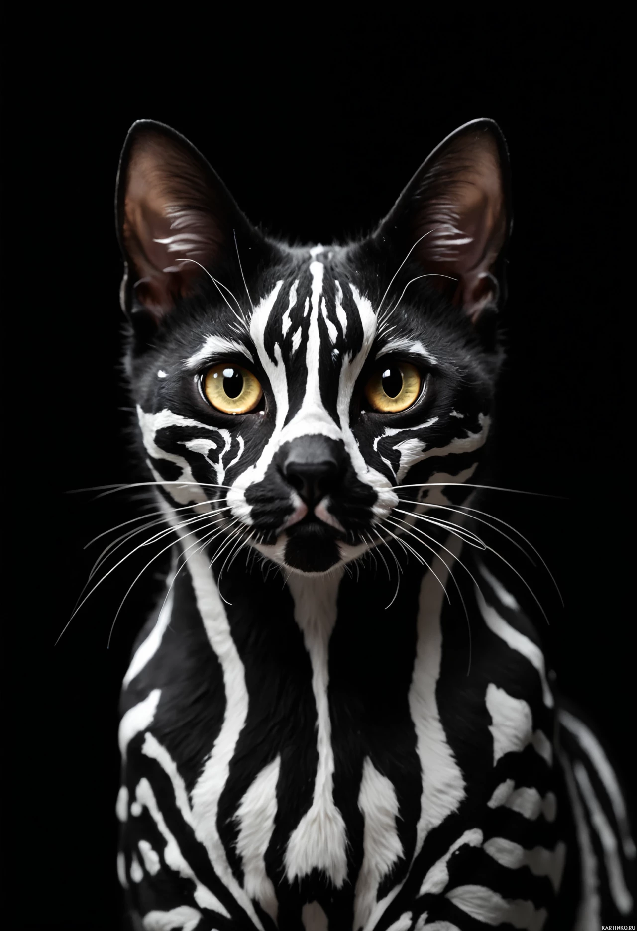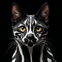 This is a photograph of a cat that has been digitally altered to have stripes painted on its fur, creating the illusion that it resembles a zebra. The cat's face and ears are visible, with the eyes wide open and