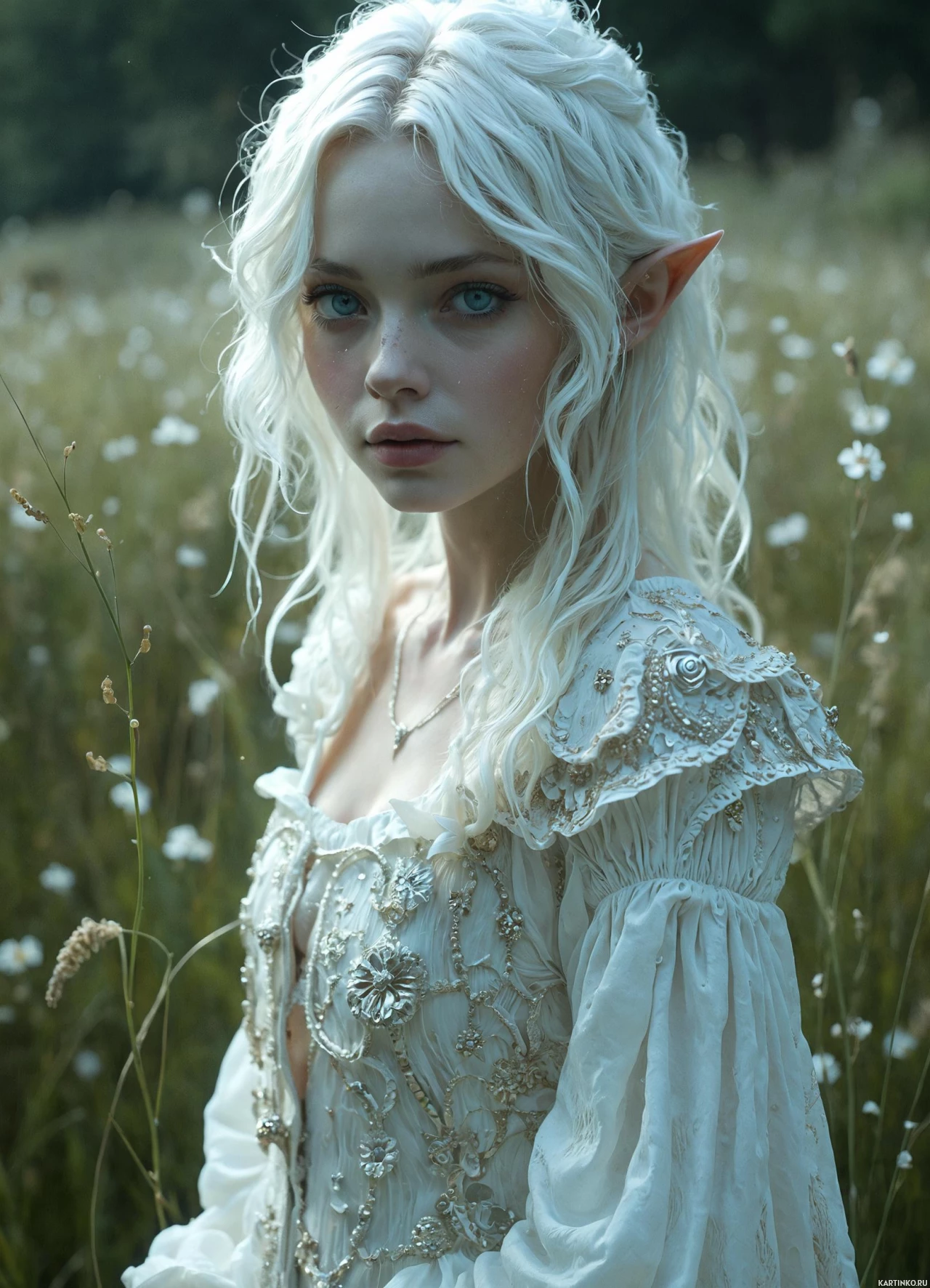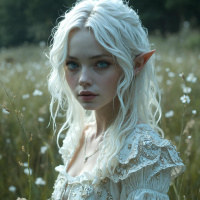 blue eyes. They have an ethereal appearance, with skin that appears pale and a complexion reminiscent of porcelain. The individual is wearing elaborate, embroidered clothing that has a fantasy or historical design, resembling the attire one might associate with elves in